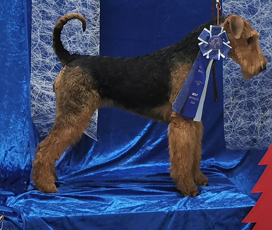 So ist ein typischer kleiner Airedale; von ausgeglichenem, unerschrockenem, fröhlichen Wesen. Mit einem sehr guten Haar, dunklen Augen, korrekten Ohren, vorzüglichem Kopf, Scherengebiss. Kräftig und gut bemuskelt.